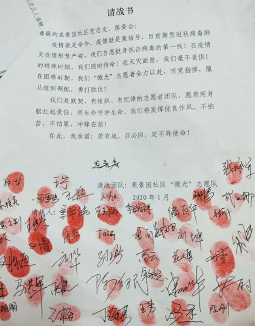 “作為黨員就要聽從組織號召,為社會(huì)做貢獻(xiàn)”。武紅娜家住槐蔭區(qū)綠地國際花都一區(qū),屬臘山街道辦事處泉景園社區(qū),她平時(shí)就熱愛公益活動(dòng),是社區(qū)志愿者群中的一員。正月初五,正是疫情最兇險(xiǎn)的時(shí)刻,當(dāng)她看到志愿者微信群里發(fā)布社區(qū)防疫召集志愿暑的動(dòng)員令,就毫不猶豫地報(bào)了名,并在請戰(zhàn)書上鄭重地簽下了自己的名字?!耙咔榫褪敲?,疫情就是集結(jié)號,我們自愿挺身抗擊病毒的第一線!在疫情的特殊時(shí)間,我們隨時(shí)待命!在天災(zāi)面前,我們毫不畏懼!在困難時(shí)期,我們微光志愿者全力以赴,聽黨指揮,服從組織調(diào)配,勇打勝仗!...... 我承諾:若有戰(zhàn),召必回,定不辱使命!”