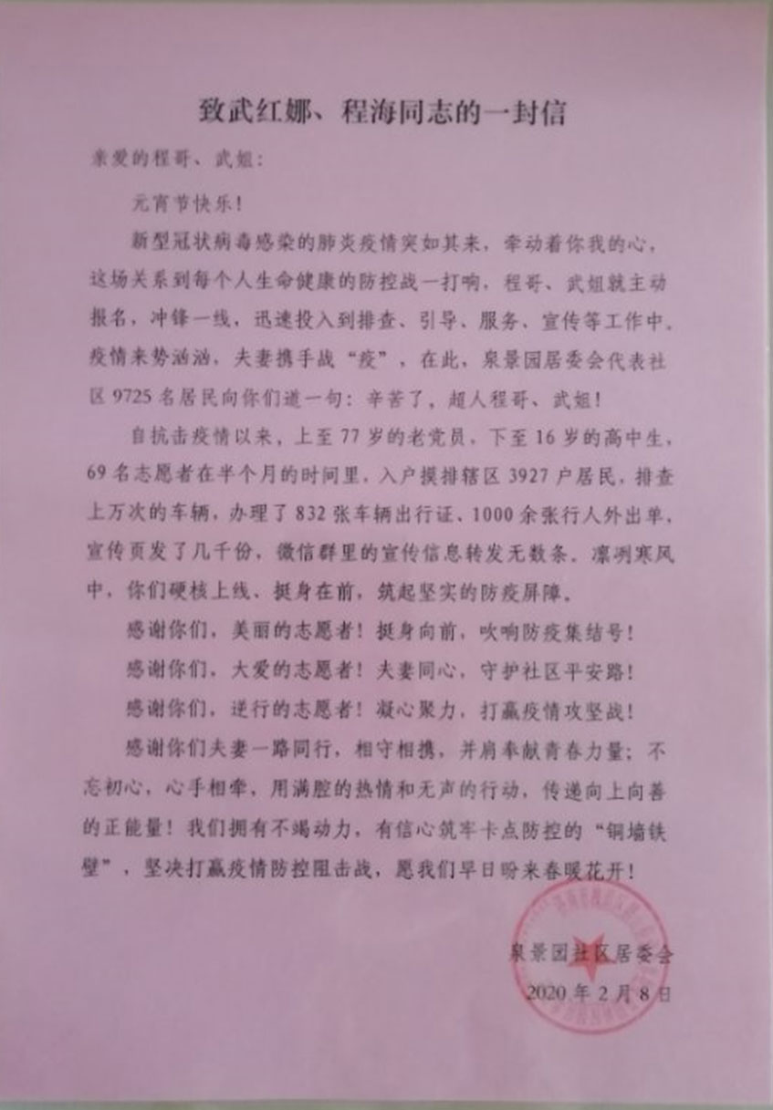 看著妻子為社區(qū)服務(wù),武紅娜的丈夫程海也坐不住了,咱是男同志更應(yīng)該為社區(qū)作貢獻(xiàn),10歲的兒子也支持爸爸媽媽為社區(qū)服務(wù),并保證一定要管好自己,認(rèn)真完成作業(yè),不用爸媽操心自己。防疫初期工作量大,需要摸排居民信息,對進(jìn)出車輛登記,他們所在的社區(qū)居民較多,為了織密防護(hù)網(wǎng),武紅娜夫妻和志愿者們不厭其煩,一戶戶登記排查,不放過任何一位居民,為方便群眾為居民車輛辦理出行證,共登記了832張車輛出行證,辦理了1000余張居民出入證,宣傳頁發(fā)了幾千份,微信群里的宣傳信息不計(jì)其數(shù),在凜冽的寒風(fēng)中,硬核上線、挺身在前,為社區(qū)筑起了堅(jiān)實(shí)的防疫屏障。程海是男同志有力氣,他主動(dòng)承擔(dān)防疫重活,每天一大早就背著消毒設(shè)備,對社區(qū)樓道、出入口、公共場所進(jìn)行大范圍噴灑消毒,并參與門口執(zhí)勤、測溫工作。武紅娜在公司復(fù)工后,把自己的值勤時(shí)間安排到了下班后。就在前幾天,晚上9點(diǎn)了,正在武紅娜要交班的時(shí)候,有一輛車悄悄駛來,沒有進(jìn)小區(qū),卻停了在路邊,她馬上前去詢問,是不是進(jìn)小區(qū)的車,并耐心解釋路邊不能停車,但司機(jī)不聽勸阻,拒不開走,其他幾個(gè)志愿者聞?dòng)嵹s來,勸阻無果。武紅娜果斷打了110,警察趕到后因其違章停車勸其駛離。當(dāng)她拖著疲憊的身軀回到家的時(shí)候,已經(jīng)11點(diǎn)了。戰(zhàn)“疫”不停,行動(dòng)不止,用自己的實(shí)際行動(dòng)踐行著初心和使命,堅(jiān)定地站在疫情防控第一線,發(fā)揚(yáng)不畏艱險(xiǎn)、無私奉獻(xiàn)的精神,貢獻(xiàn)著自己的力量。夫妻攜手戰(zhàn)“疫”,2月8日,居委會(huì)寫來感謝信,代表泉景園居委會(huì)9725名居民向他們說了一句肺腑之言,“辛苦了,超人武姐、程哥”。